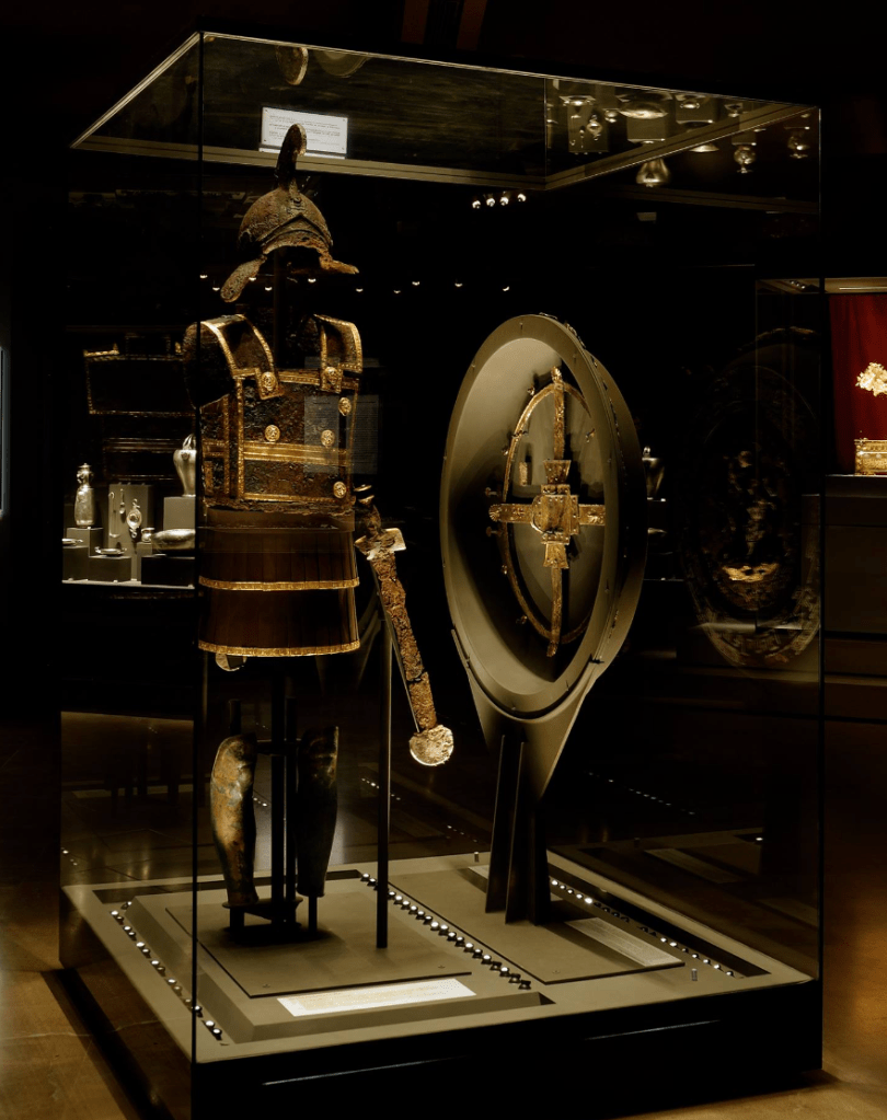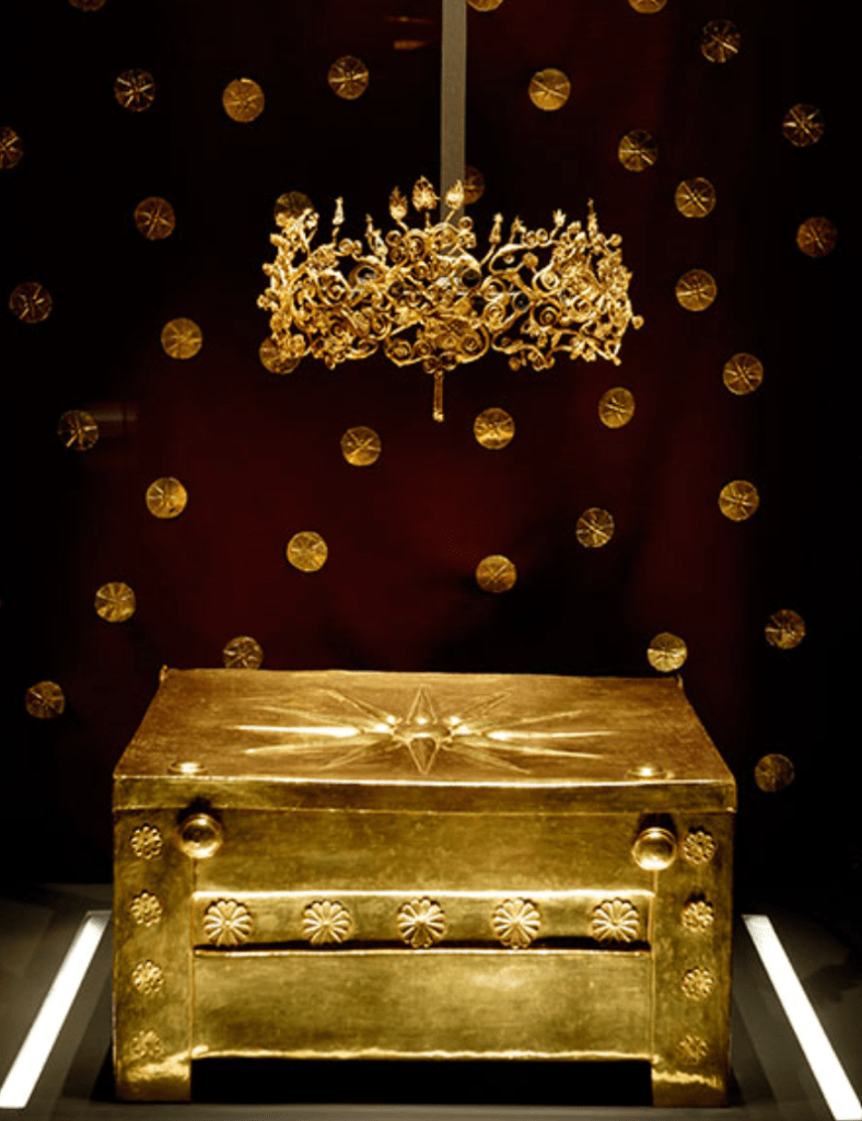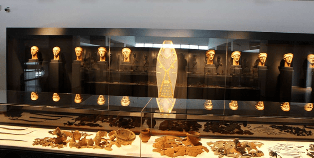 Hundreds of items are displayed, including beautiful gold creations, elaborate jewelry, colorful wall paintings, mosaics, hundreds of ancient items, including a richly carved burial bed, and others used.